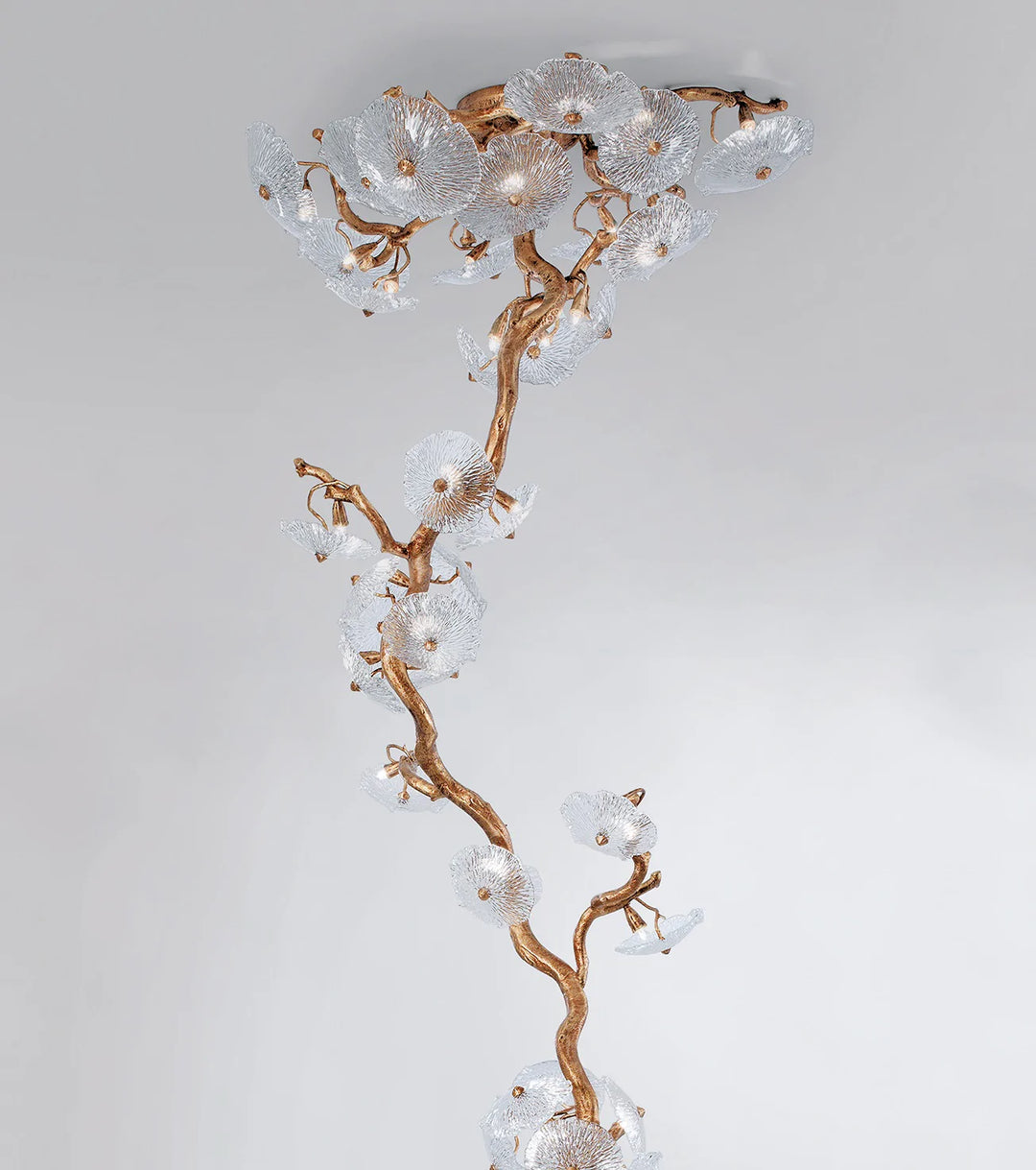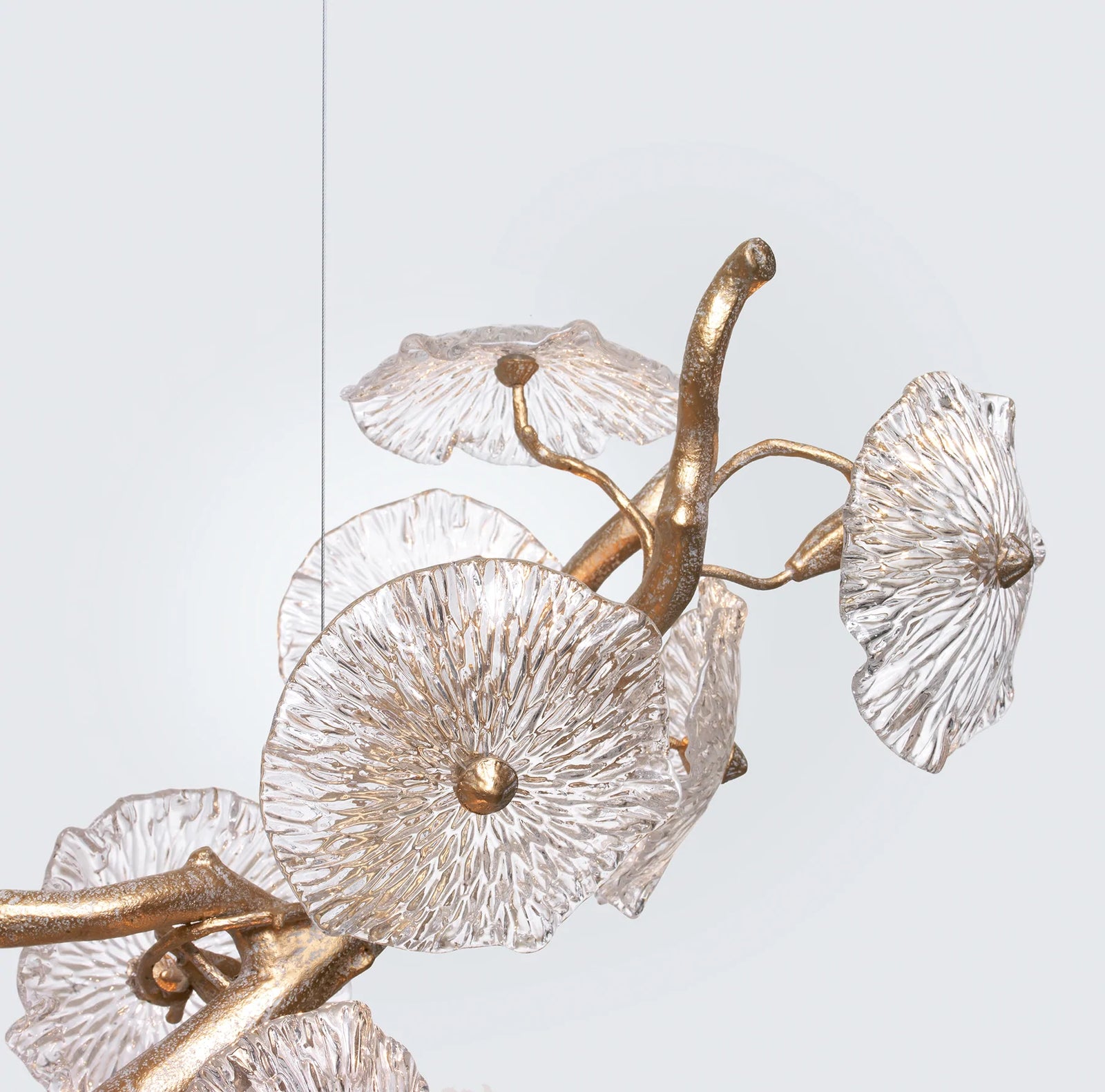 Ethereal and whimsical, the Nenufar Chandelier stands closely connected to its direct inspiration, aqueous nature. Beyond its particular dense structure and closed shape, it seeks an uncanny levitating sense, allowing multiple perspectives through the carefully crafted Murano glass pieces. These glass specifications achieve diffuse lighting, something that approaches this collection to a living organism, and which often ends up reminiscent of the natural beauty of a water lily. Material: Copper Plating + Acrylic Emitting Color: Warm White Light Source: Energy Saving
