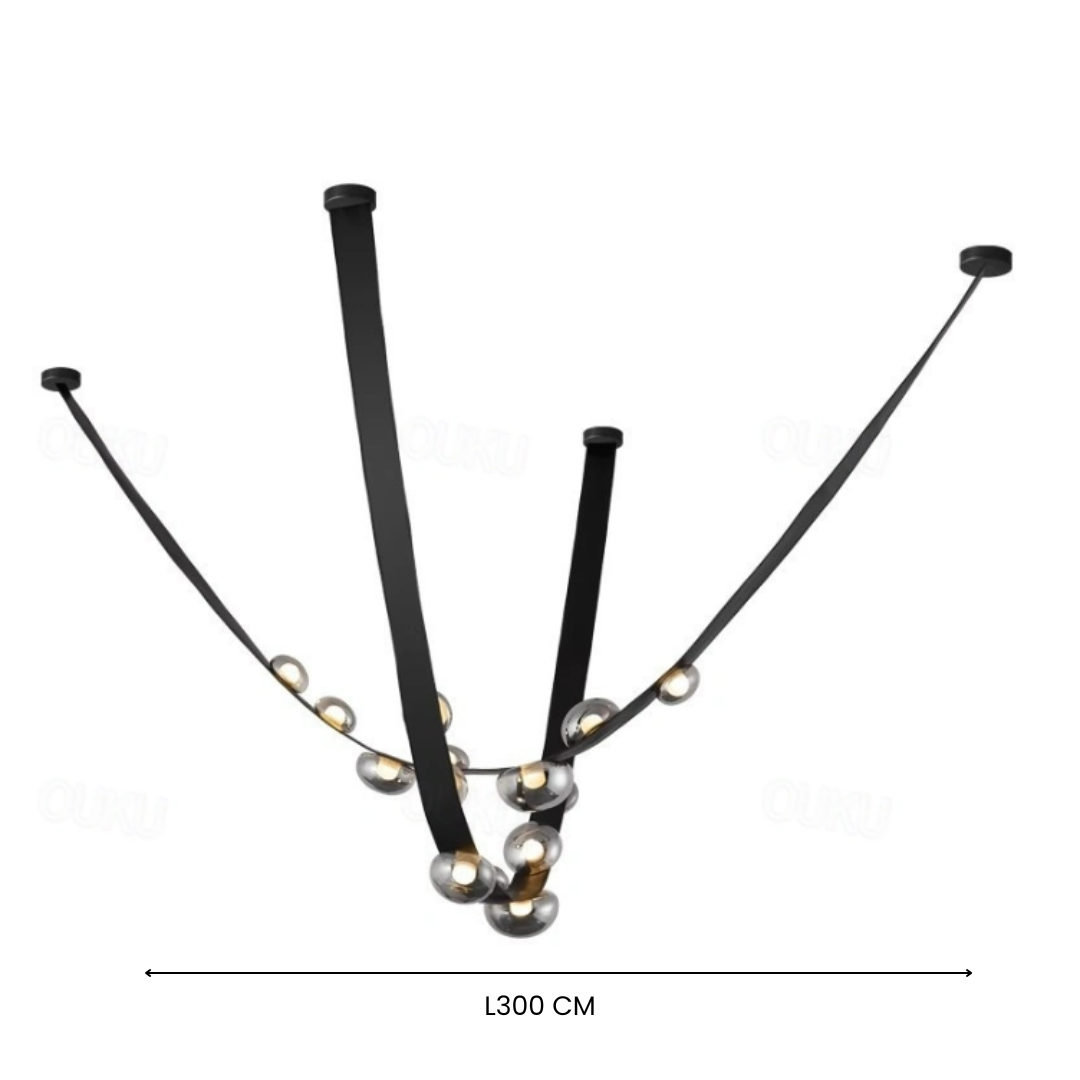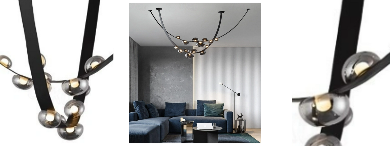 Where art meets atmosphere — the Midnight Orbit Chandelier is a sculptural statement of modern elegance. Crafted with fluid black metal curves and suspended smoked glass orbs, each element appears to float in perfect cosmic balance. Inspired by planetary motion and the quiet beauty of twilight, this piece transforms any space into a gallery of light and form. Whether placed above a dining table, in an entryway, or within a contemporary living room, the Midnight Orbit creates a dynamic play of shadows and glow, captivating from every angle.