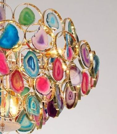 This is a luxurious agate chandelier. The natural agate rough is sliced, polished, perforated, and made. The agate is brightly colored and has a smooth surface. It has a strong light transmission and no glare. The lamp body is made of metal, welding, grinding, electroplating, etc. Material: Copper Plating + Resin + Glass Emitting Color: Warm White Light Source: Energy Saving, G4