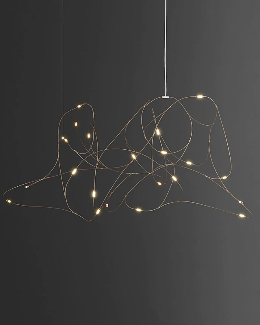 Flock of Light captures the magic of a warm summer evening. Bronze wires, brass cups with semi-transparent polycarbonate diffusers.