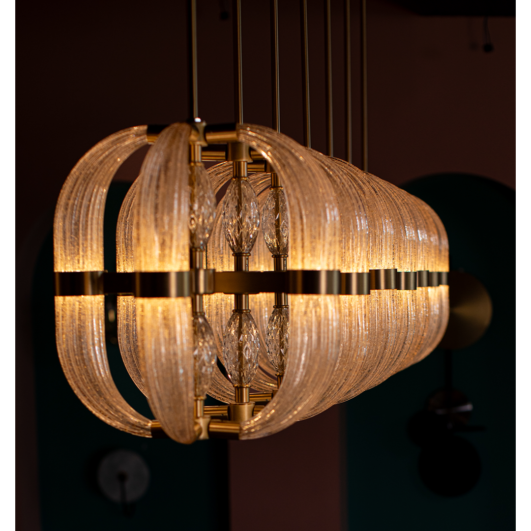 The chandelier presents a mesmerizing contrast between the imperfect, organic, and sinuous lines of hand-blown glass and a sleek metallic modular structure. The fluid, exuberant forms of the molten glass are elegantly contrasted by the structured strength of the metallic rings, creating a dynamic interplay of softness and strength, sensuality and character.
