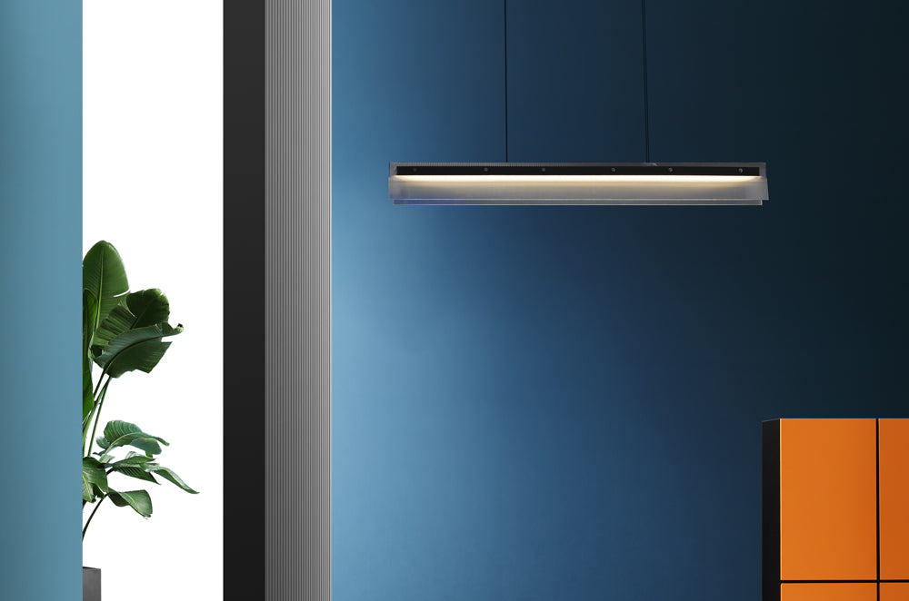 This sleek linear pendant light sticks to modern lighting design basics, using a thick piece of frosted acrylic set within an aluminum frame.