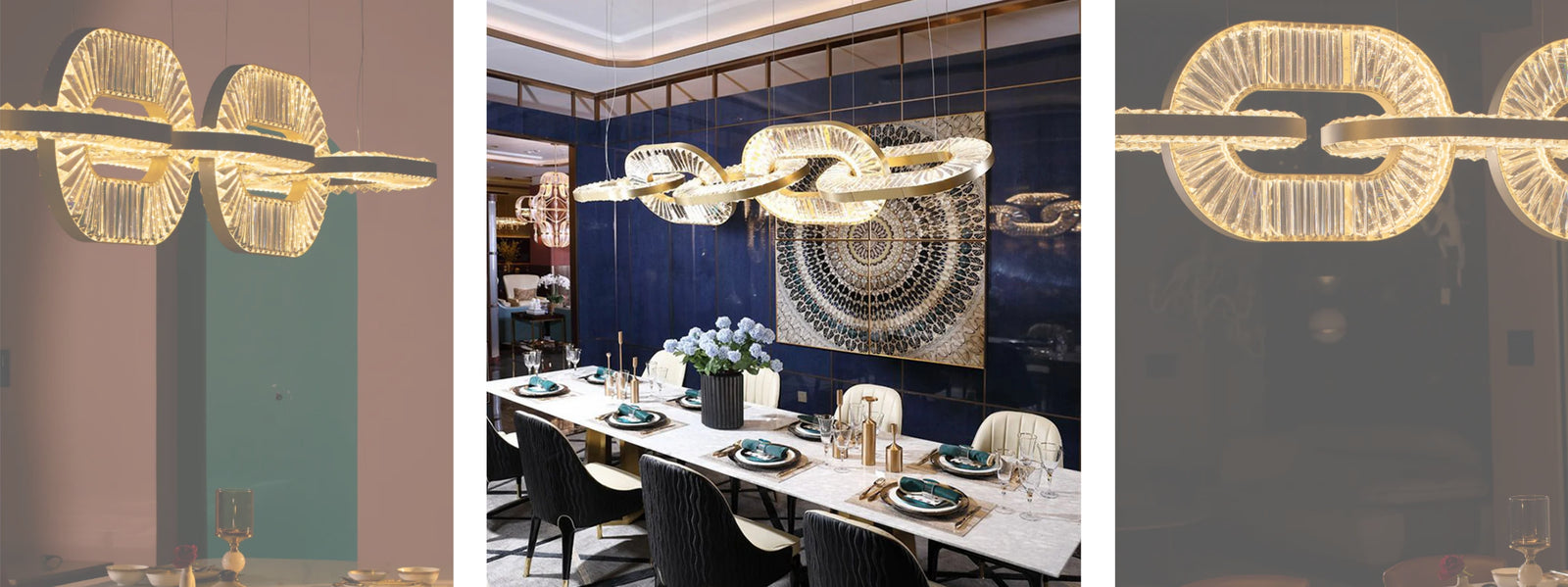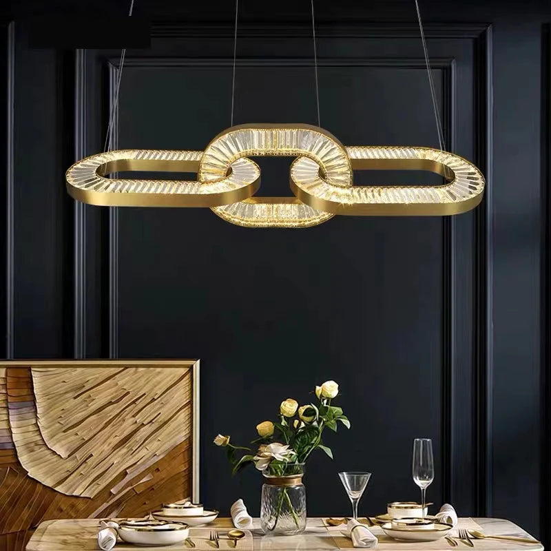 Crafted with precision and innovation, our Linked Rings Grand Chandeliers feature a captivating design of interconnected metal rings that gracefully suspend from your ceiling. The rings dance in harmony, creating a mesmerizing play of light and shadow that transforms any room into a visual masterpiece. Whether you're seeking a statement piece for your home, office, or event space, our Linked Rings Chandeliers offer a unique fusion of form and function. With their versatile designs and captivating aesthetics, they effortlessly complement a wide range of interior styles.