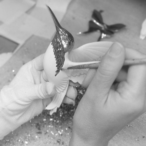 Two rows of flowering porcelain buds form a ring within which a small flock of porcelain birds circles.