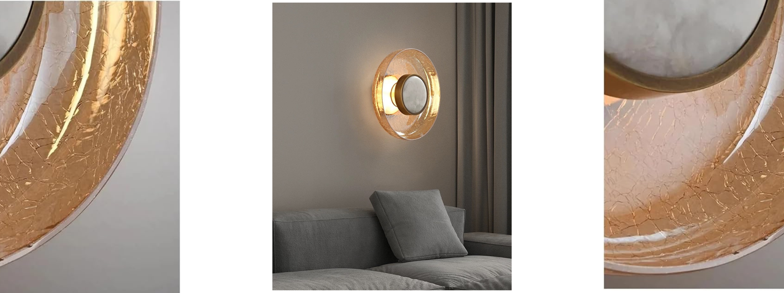 Aurelia Glow Wall Light The Aurelia Glow wall light exudes timeless sophistication through its fusion of golden brass and delicately cracked glass. The textured glass softly diffuses light, creating a warm, radiant ambiance that elevates any space with understated luxury. Perfect for hallways, bedrooms, or living spaces, this piece reflects the essence of refined craftsmanship — where elegance meets illumination by Ivanka Lumiere.