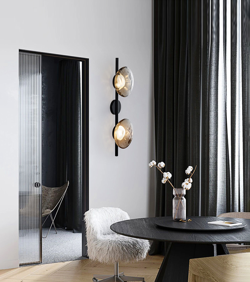 Ocean captures the variation and rippling of the surface of the ocean. Each piece reflects a unique pattern, emitting a delicate luminosity, highlighting the presence of the sea. The Ocean Wall Sconce reflects the shadows of the glass against the wall, replicating the natural flow and movement of water. Material: Aluminium + Iron Color: amber glass + black metal Bulb specification: LED Emitting Color: Warm White Light Source: Energy Saving, Bulb Specification: LED 6W EACH