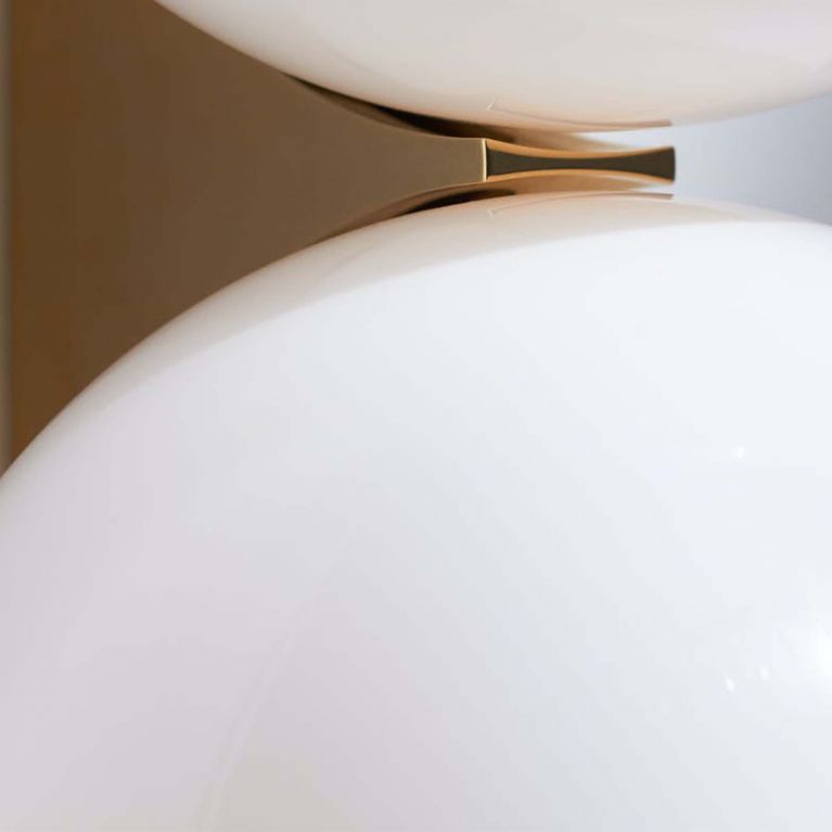 The lamp's base, which mounts to the wall, is constructed from brass. This choice of material not only adds a touch of luxury but also enhances the lamp's overall brilliance. The warm, reflective quality of the brass base complements the opal glass diffusers, creating a harmonious balance between contemporary style and classic opulence.