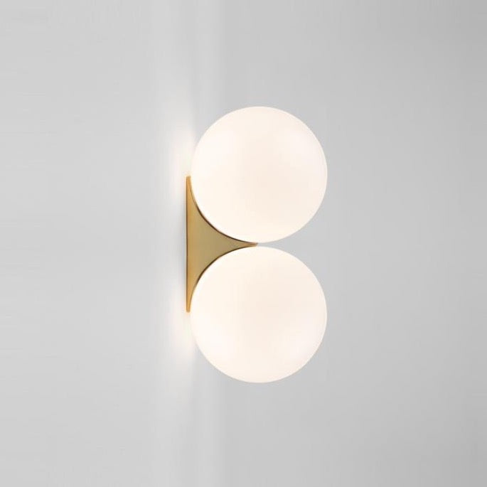 Designed with an emphasis on simplicity and quality, this wall lamp seamlessly blends into various interior styles. Its understated yet sophisticated presence makes it ideal for adding a refined touch to spaces such as living rooms, bedrooms, or hallways. The lamp's clean lines and elegant materials ensure it remains both a functional light source and a striking piece of decor. By combining modern design with timeless materials, this lamp provides both style and substance. Its dual-sphere configuration and luxurious brass base make it a standout feature in any contemporary setting, offering an element of sophistication and charm that enhances the ambiance of your home.
