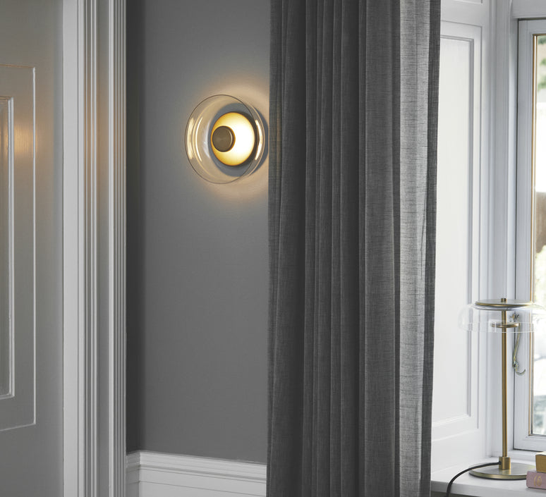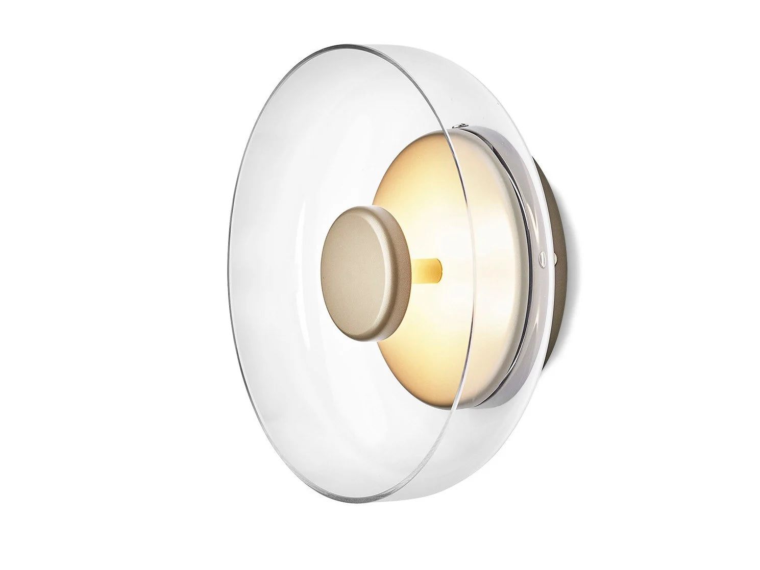 This innovative wall light is made with the latest LED technology. Thanks to a specially developed LED disc, the light is reflected in the hand-blown glass shade and the gold-plated metal, providing a soft and sophisticated indirect lighting effect