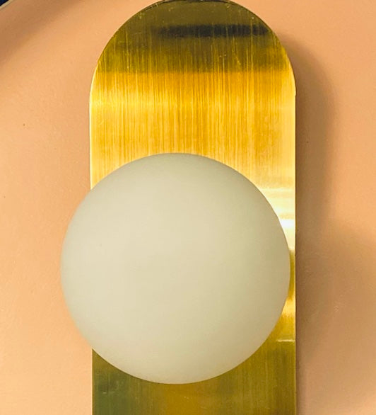 The two elegantly designed glass shades are a focal point of the sconce, contrasting beautifully with the brass finish. Their sleek, translucent surfaces create a visual interplay with the metal, enhancing the sconce's depth and beauty. The glass shades are carefully crafted to diffuse light softly and evenly, casting a warm, inviting glow that enhances the ambiance of any room. Whether placed in a living room, hallway, or bedroom, the **Mid-Century Modern Brass Wall Sconce** brings an elegant and stylish touch to your interior. Its blend of classic mid-century design with modern sophistication ensures that it serves as both a functional light source and a captivating piece of decor. Experience the perfect harmony of form and function with this wall sconce, and let its refined aesthetics transform your living space into a haven of style and sophistication.
