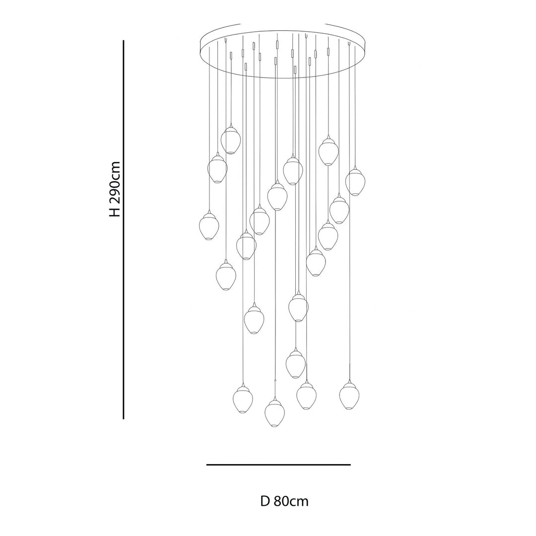 Crafted from hand-blown glass pendants and supported by a sleek metal framework, Asha creates a cascading effect of light that feels weightless yet deeply luxurious. Each glass element glows with a warm, radiant brilliance, enriching your space with depth, height, and refined sophistication.